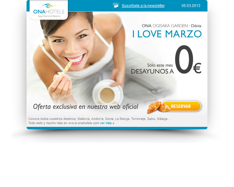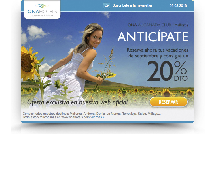 Newsletter de periodicidad mensual del grupo hotelero Onahotels, con hoteles repartidos por la costa mediterránea y Baleares.